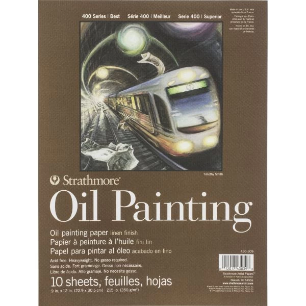 Strathmore 400 Series Oil Painting Pad 9″X12″ – Oil Painting paper provides artists with a convenient alternative to canvases or boards for oil paints and oil pastels. No gesso required to prevent oil saturation, just simply tear out a sheet and start painting! The linen surface mimics canvas while providing texture to help blend and hold layers of paint in place. This package contains one pad of ten sheets of 9×12 inch 215lb paper. Acid free. Imported.