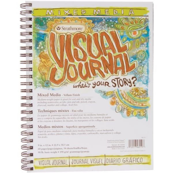 Strathmore Visual Journal Mixed Media Vellum 9″X12″ – This journal is great for wet and dry media including watercolor, acrylic, pen and ink, pencil, crayon, charcoal, marker, and collage. This package contains one 9×12 inch spiral-bound art pad with 34 sheets of 90-pound paper with a vellum finish. Acid free. Made in USA.