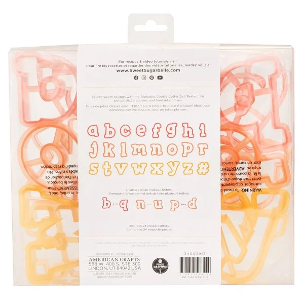 Sweet Sugarbelle Cookie Cutters 24/Pkg – Create sweet sayings with the alphabet cookie cutter set! Perfect for personalized cookies and fondant phrases. This package contains 24 cookie cutters. Cookie cutter are dishwasher safe. Food safe. Imported.