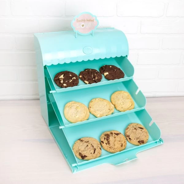 Sweet Sugarbelle Pop-Up Bake Shop 8pcs – Sweet Sugarbelle Pop Up Bake Shop is a treat carrier and cookie display all in one! This fun display would be perfect for dessert tables for your next party. Decorate, transport then display your sugar cookies in style! This 13x13x5 inch package contains one nesting box, three trays, one dry erase sign and three interchangeable vinyl expressions. Food safe. Hand wash. Imported.