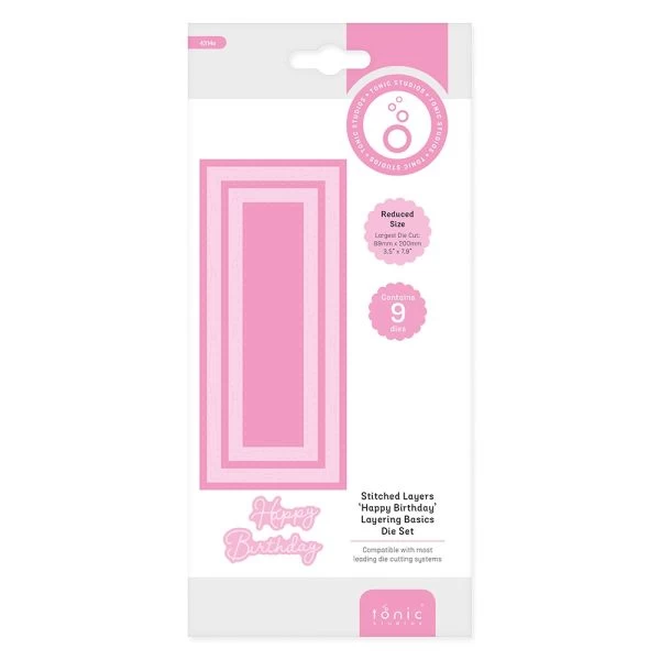 Tonic Studios Layering Basics Die Set – Cut gorgeous layers for your slimline cards with these new additions to the Tonic Studios Layering Basics range. Each set comes with multiple layering dies but also includes an adorably simple sentiment die set! Your Stitched Layers Happy Birthday Layering Basics Die Set contains 9 essential shape dies & 4 gorgeous sentiment dies perfect for A10 slimline cardmaking! Largest Die Size: 90mm x 201mm (3.5×7.9 inches)