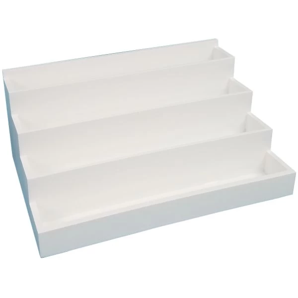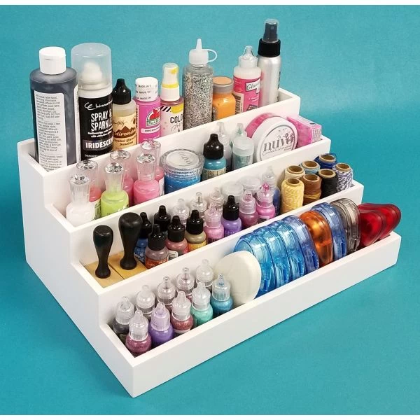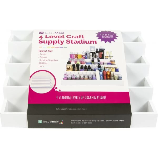 Totally-Tiffany Stamp & Supply Stadium – This desktop craft supply storage shelf is ideal for craft room organization. The 4 Level Stamp & Supply Stadium is four levels high. Each level is 1.75 inch deep. Perfect for small paint bottles, punches, glitter bottles and more. Perfect for your desk or shelf but can also be wall-mounted. This package contains one 15x9x5.5 inch supply stadium. Imported.