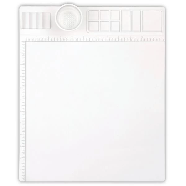 We R Memory Silicone Workspace & Stencil Mat 12″X12″ – Non-stick, waterproof, and heat-resistant multi-function craft mat. Recessed work area measuring approximately 12×12 inches. Features built in brush holders, a collapsible water cup with cleaning ridges, and multiple sized reservoirs. Perfect for painting, clay modeling, epoxy resin projects, and more! Imported.