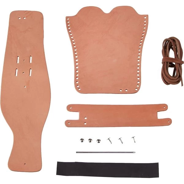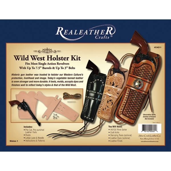 Wild West Holster Kit – Become a cowboy with this wild west holster kit. This 9x12x2.5 inch package contains pre-cut, pre-punched leather parts, rivets, latigo lace & needle, instructions and patterns. You will need: #8100 rivet setter, craft knife, stamping tools (optional), leather dyes (optional), and leather finish. Makes one holster. Imported.