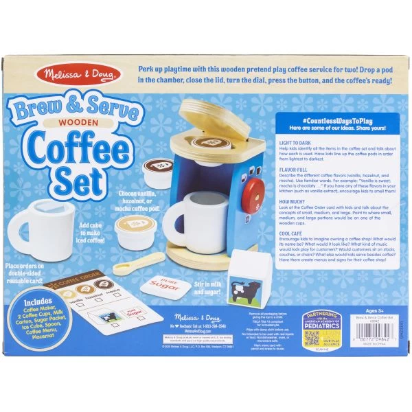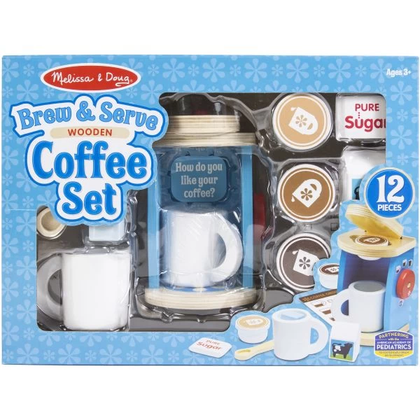 Wooden Brew & Serve Coffee Set – Pretend-play tea parties can now include coffee with this realistic wooden Brew & Serve Coffee Set for two! Lift the lid and pop in one of three coffee pods 9regular, hazelnut or mocha) and turn the knob to choose the serving size! Too hot for coffee? Add the included ice cube to make it ‘iced’. This 10×4.1×13.6 inch package contains two mugs, three coffee pods, sugar, creamer, spoon, ice cube and menu card. Recommended for Ages 3 years and up. Imported.