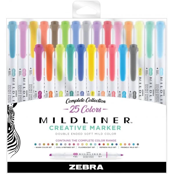 Zebra Mildliner Double Ended Highlighters 25/Pkg – Mildliner Brush is conveniently double-ended with a paint brush-like tip and fine marker in one pen. Mild water based pigment ink is translucent, excellent for layering and doesn’t bleed through. The brush tip is like an artist’s brush, allowing for thick or thin strokes while the fine tip marker provides more consistent lines. AP certified non-toxic. Package contains 15 Zebra Mildliner Double Ended Brush Pen & Markers in blue, blue green, yellow, orange, pink, brown, vermilion, gold, magenta, smoke blue, red, violet, gray, dark blue and green. Imported.
