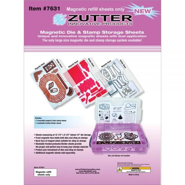 Zutter Magnetic Die & Stamp Storage Refill Sheets 3/Pkg – Zutter-Magnet Sheets. Store your die-cut and cling on stamps in this large size magnetic storage system! Fits perfectly in your Zutter magnetic die & stamp storage case. This package contains three 12-1/4×8-1/2 inch magnetic sheets and three 12-1/4×8 inch dividers. Imported.
